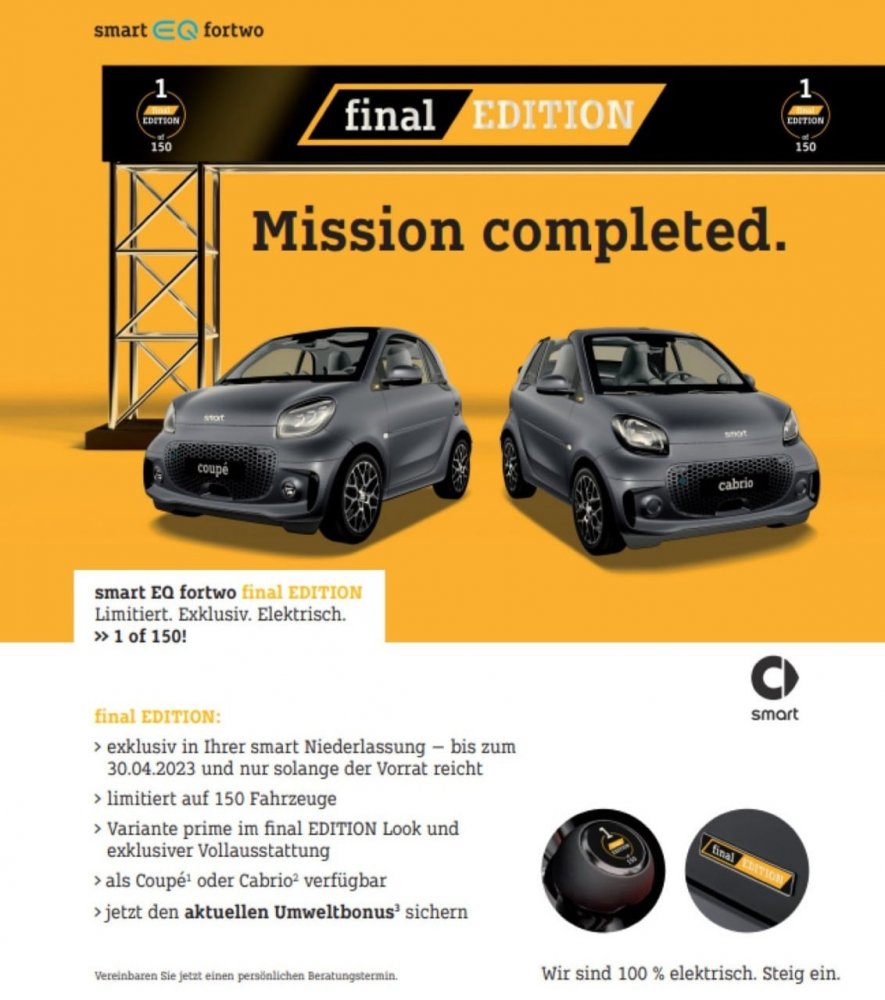 Никаких официальных прощальных версий smart EQ fortwo не будет, но некоторые дилеры решили оформить «последнюю гастроль» модели самостоятельно: например, продавец из Мюнхена выставил на продажу 150 электромобилей в исполнении Final Edition, вся особость которых сводится к максимальной комплектации и самопальным наклейкам Final Edition на боковинах и селекторе режимов силовой установки. Регулярные версии тоже пока доступны для заказа: хэтчбек smart EQ fortwo стоит в Германии от 21 940 евро, кабриолет smart EQ fortwo cabrio — от 25 200 евро. Обе версии оснащаются 81-сильным электромотором на задней оси и батареей ёмкостью 17,6 кВт·ч, полного заряда которой хватит на 123-135 км пробега в зависимости от модификации.