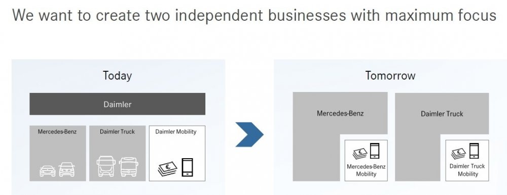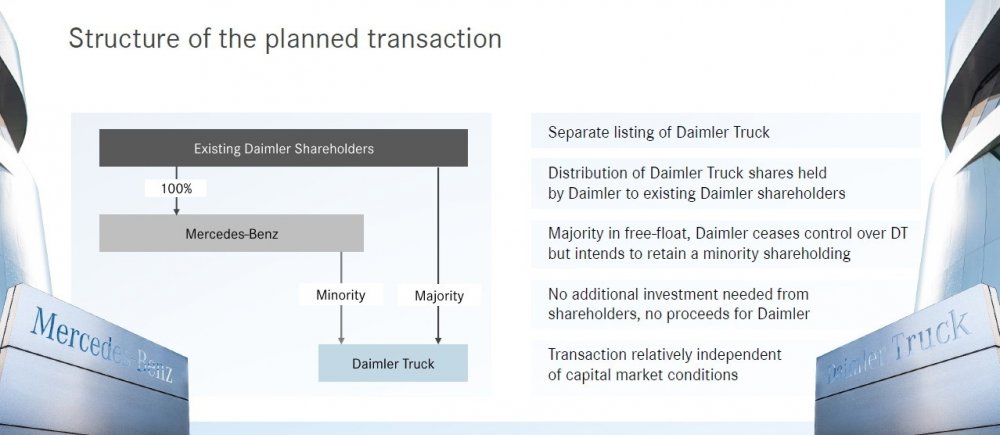Руководство Daimler приняло решение разделить концерн на две независимые компании — Mercedes-Benz и Daimler Truck. Предполагается, что таким образом нынешние два подразделения одного концерна станут более гибкими на рынке, а Daimler Truck сможет привлечь дополнительные инвестиции, необходимые для перехода на экологически чистую технику — электрические и водородные грузовики.