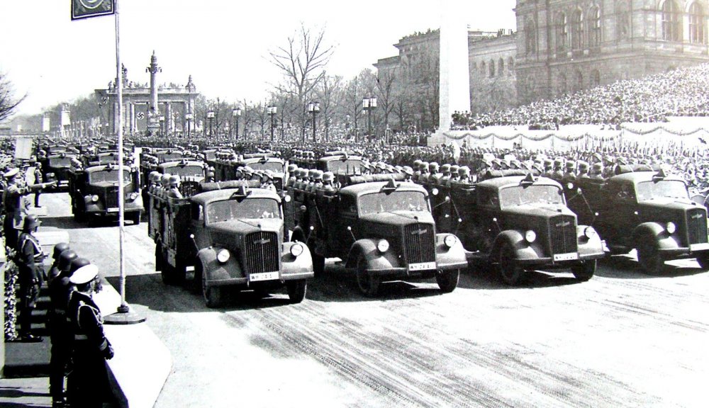 На параде в Берлине массовые грузовики Opel Blitz 3,6-36S со скамьями в кузовах на 12 солдат