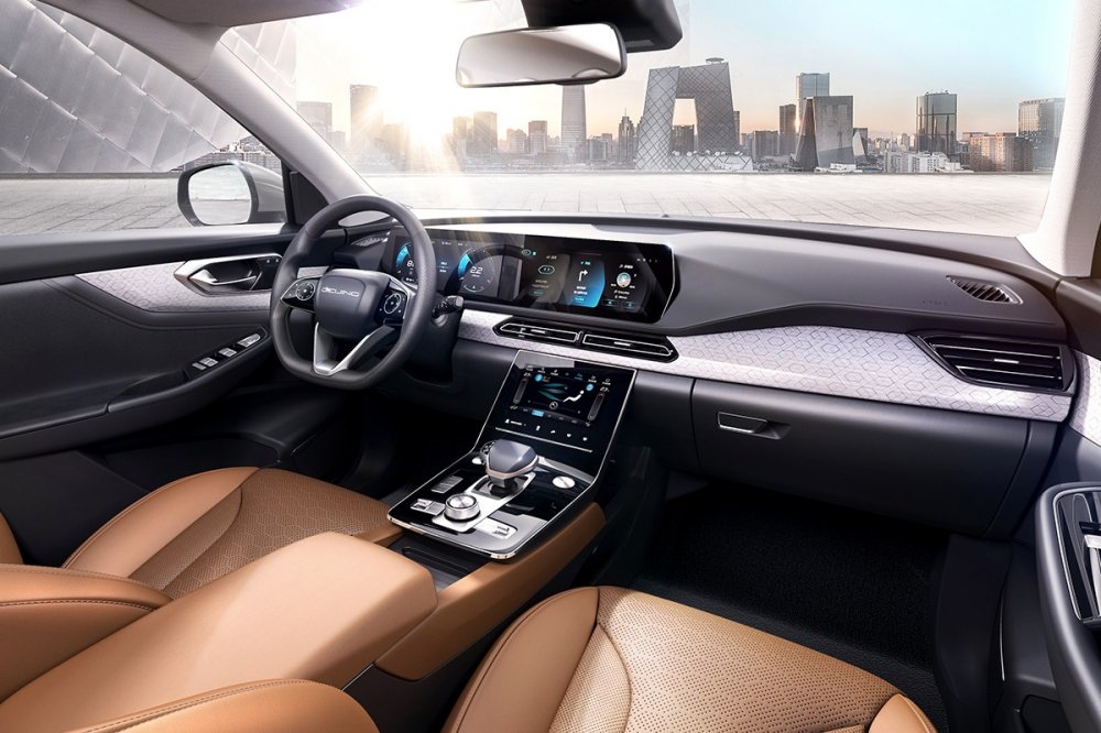 К слову, по меркам всех прежних моделей BAIC с традиционным силовым агрегатом, интерьер у Beijing X7, прямо скажем, впечатляет. Во-первых, внимание привлекает большой «телевизор» (как у моделей Mercedes-Benz), объединяющий щиток приборов и экран мультимедийной системы. Чуть ниже размещается консоль с управлением климатической системой – опять же, без единой «механической» кнопки. Рядом с селектором «автомата» – кнопка пуска двигателя из фрезерованного алюминия. И вообще, судя по фотографиям, конструкторы на славу потрудились над интерьером, не поскупившись на качественную отделку. Вполне может быть, этот автомобиль станет одним из самых люксовых на рынке Китая и определит дальнейший вектор развития всей линейки BAIC Beijing.