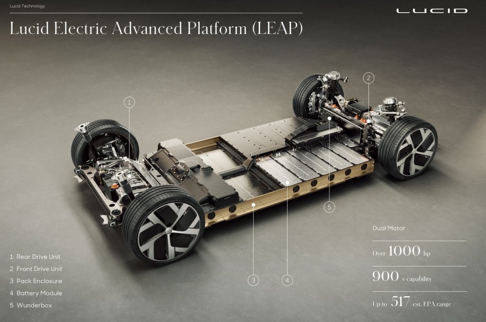 В основе седана Air лежит оригинальная платформа LEAP (Lucid Electric Advanced Platform) с интегрированной в пол 900-вольтовой литий-ионной батареей ёмкостью 113 кВт∙ч (ячейки поставляет LG Chem). Колёсная база — 2960 мм, габаритная длина — 4975 мм. Багажника два — передний на 202 л и задний на 456 л. Подвеска не пневматическая, как можно было бы ожидать из названия модели, а пружинная, с адаптивными электронно-управляемыми амортизаторами: передняя — на двойных поперечных рычагах, задняя — многорычажная. Коэффициент аэродинамического сопротивления кузова сх — 0,21.