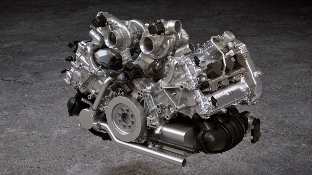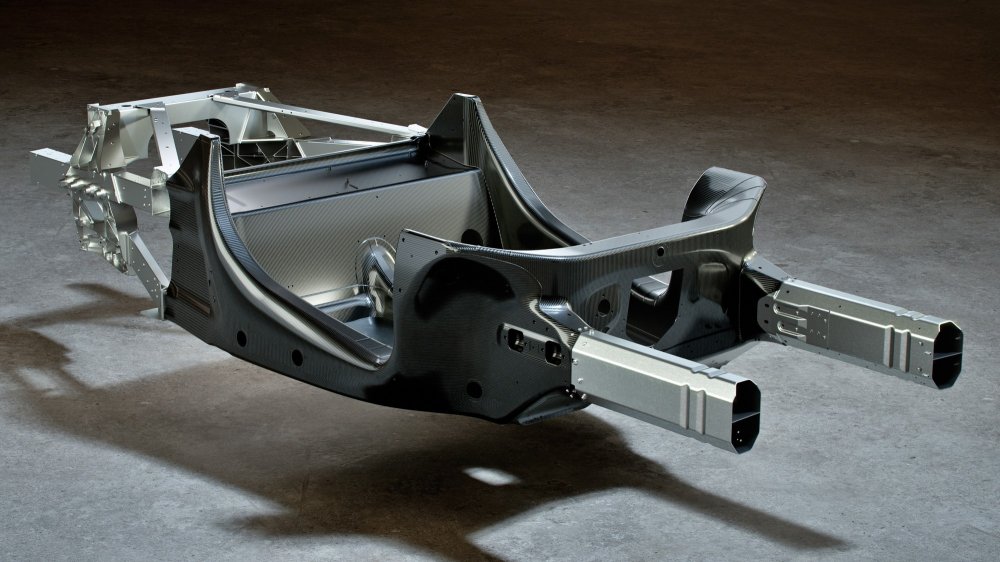 Теперь к силовой установке. Она построена вокруг разработанного с нуля алюминиевого бензинового V6 (заводской индекс М630) с рабочим объёмом 2993 «кубика», развалом блока в 120 градусов, сухим картером, непосредственным впрыском топлива (350 бар) и двумя турбокомпрессорами в развале блока. Заявленная масса — всего 160 кг. Для сравнения скажем, что новый 3,0-литровый двигатель Aston Martin TM01 весит около 200 кг, Maserati Nettuno V6 с тем же рабочим объёмом — 220 кг. Максимальная мощность двигателя М630 составляет 585 л.с. при 7500 об/мин, максимальный крутящий момент — 585 Нм в диапазоне от 2250 до 7000 об/мин, предельные обороты двигателя — 8500 об/мин.
