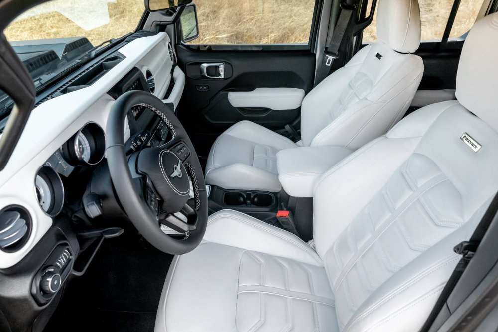 К новой донорской раме калифорнийская фирма привязала и рестайлинг кузова с углепластиковыми панелями – чуть элегантнее стали передний бампер и корма, а задние двери теперь открываются традиционно, то есть вперёд (по основному ходу), а не назад. В целом же сохранена исходная эстетика условно военного внедорожника, максимально брутального снаружи и максимально комфортного внутри. Интерьер, понятное дело, позаимствован у Wrangler серии JL, но часть панелей изготовлены из углепластика и вручную обиты кожей.
