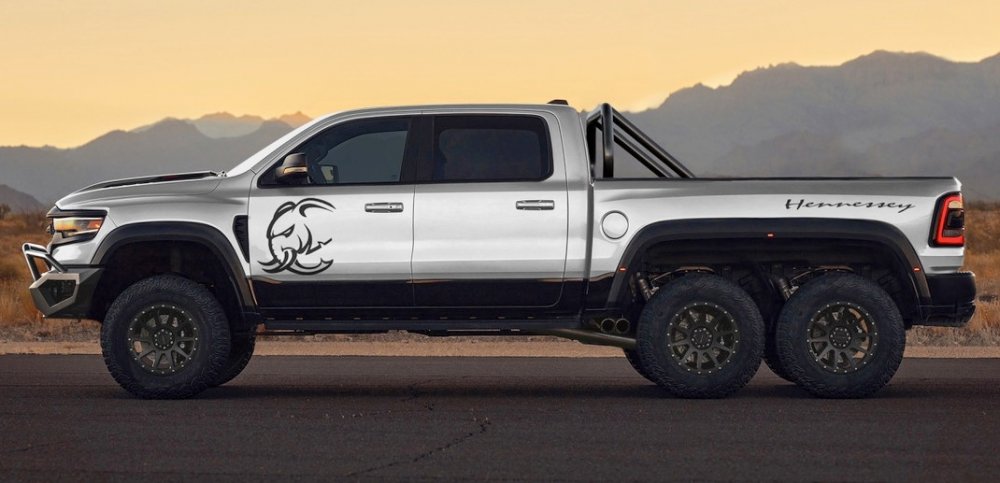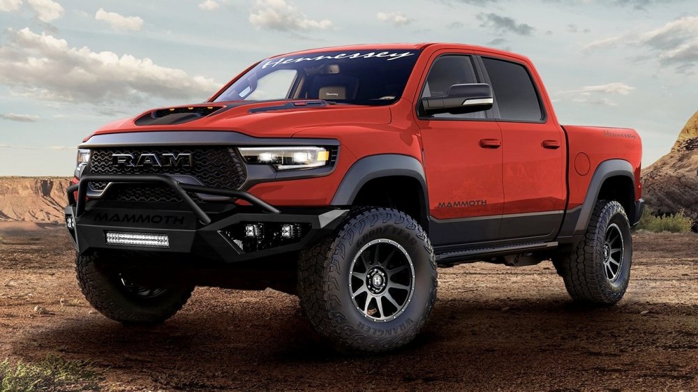 Анонсированный на этой неделе двухосный Mammoth 1000 проще и дешевле трёхосного собрата — 135 350 долларов за экземпляр, при том что стоковый Ram 1500 TRX стоит от 70 095 долларов. Мотор в Mammoth 1000 остаётся стоковый, 6,2-литровый HEMI, но специалисты Hennessey снабдили его новой 2,65-литровый «мясорубкой», усиленными шкивами, модернизированными системами впуска и выпуска с пониженным сопротивлением, улучшенной системой вентиляции картерных газов и переписанной программной управления. В результате отдача выросла до 1026 л.с. и 1314 Нм. Время разгона до 60 миль/ч (96,56 км/ч) сократилось с 4,5 до 3,2 с.