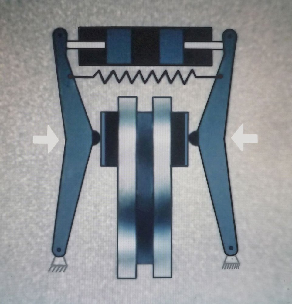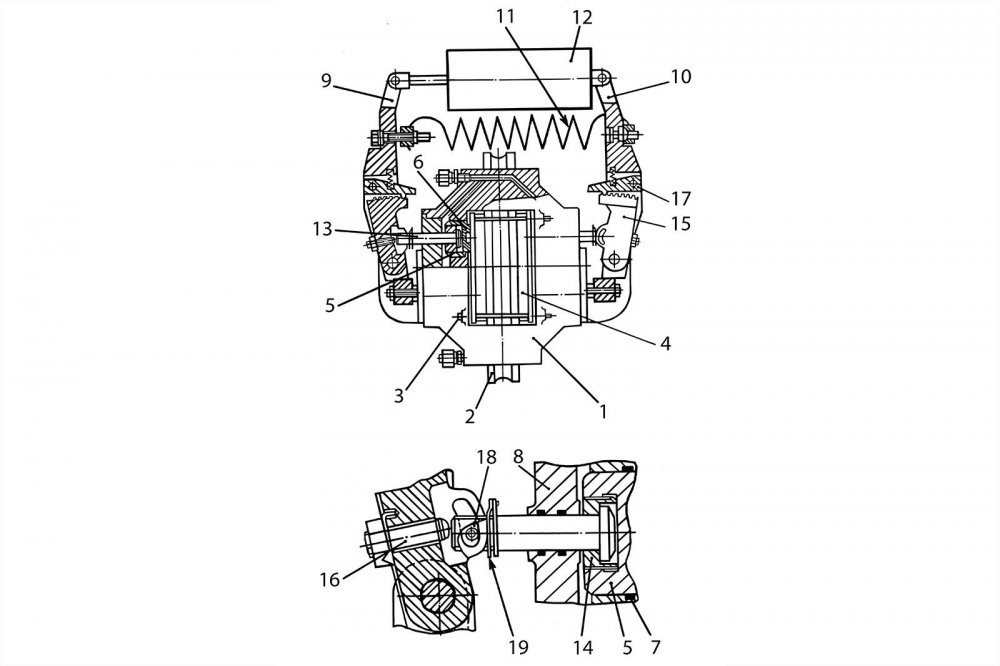 При смещении поршней суппорта в сторону диска перемещаются и связанные с ними штоки, которые, увлекая за собой храповики, поворачивают их на величину, пропорциональную зазору между колодками и диском. По мере износа накладок тормозных колодок зазор между ними и диском увеличивается, и при перемещении поршней и штоков на величину, пропорциональную шагу зубьев храповика, собачки входят в зацепление с последующими зубьями храповиков, тем самым автоматически поддерживая постоянство зазора в приводе стояночного тормоза.