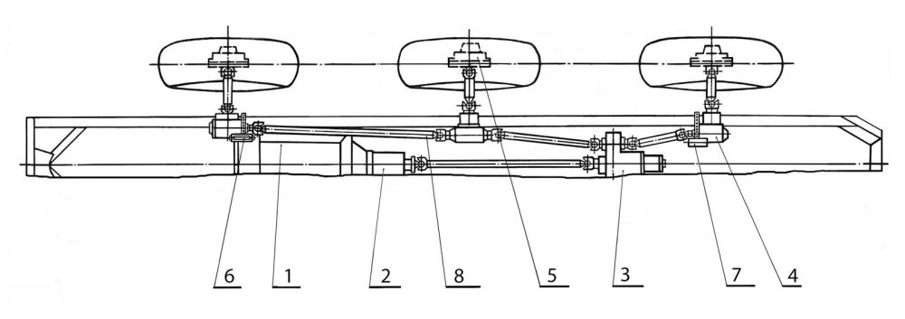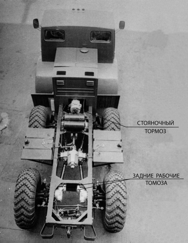Отсутствие жесткой кинематической связи колес каждого борта между собой привело к тому, что дисковые рабочие тормоза с двухконтурным гидроприводом теперь пришлось расположить на бортовых редукторах всех колес, а стояночные – на рабочих механизмах передних и задних колес. Естественно, что и в таком исполнении тормозная система работала безукоризненно.