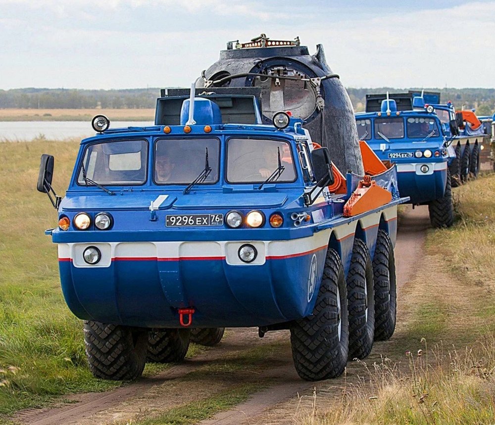 Итак, 1975-й стал годом рождения нового поколения плавающих машин комплекса «490», предназначенных для поиска спускаемых аппаратов и эвакуации космонавтов. Базовую модель – ЗИЛ-4906 – оборудовали грузовым отсеком и двухбалочным гидравлическим телескопическим краном, а ЗИЛ-49061 стал обладателем комфортабельного пассажирского салона с семью местами для сидения и тремя – для лежания. Интересно, что по компоновке «Синяя птица» оказалась наиболее близка к своему прародителю ПЭУ-1: равнорасположенные по базе оси, двигатель позади кабины экипажа, Н-образная схема трансмиссии, передние и задние управляемые колеса.