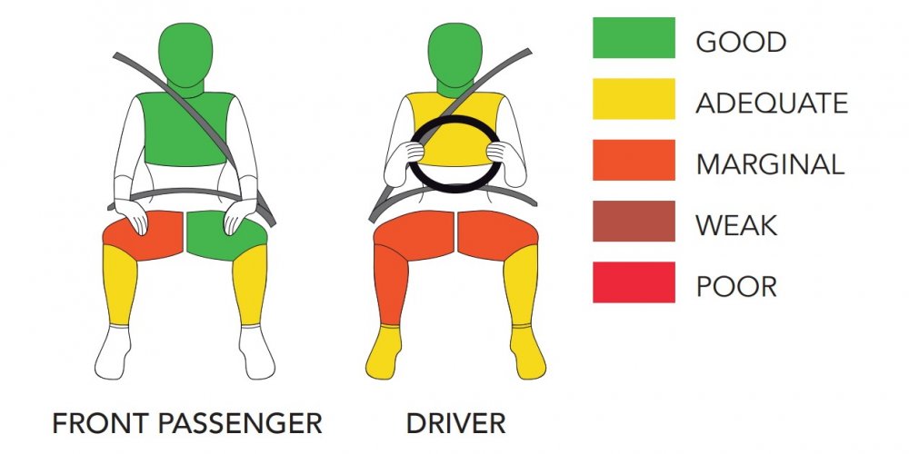 Даже в топовой комплектации Mahindra Thar имеет всего две фронтальные подушки безопасности, а в базовой нет ESP – только ABS. Программа Global NCAP предусматривает всего один краш-тест: фронтальный удар на скорости 64 км/ч о деформируемый барьер, установленный с 40-процентным перекрытием стороны водителя (из современной программы Euro NCAP этот краш-тест, к слову, уже исключён как устаревший). Боковой удар о деформируемый барьер на скорости 50 км/ч — опция для производителя для достижения максимального 5-звёздного рейтинга за защиту взрослых, но такой рейтинг ставится только при успешном прохождении обоих краш-тестов. Увы, фронтальный удар Mahindra Thar выдержал не вполне успешно, а потому боковой краш-тест, с которым Thar справился хорошо, ему не помог — итого только 4 звезды за защиту взрослых, да и то с оговорками.