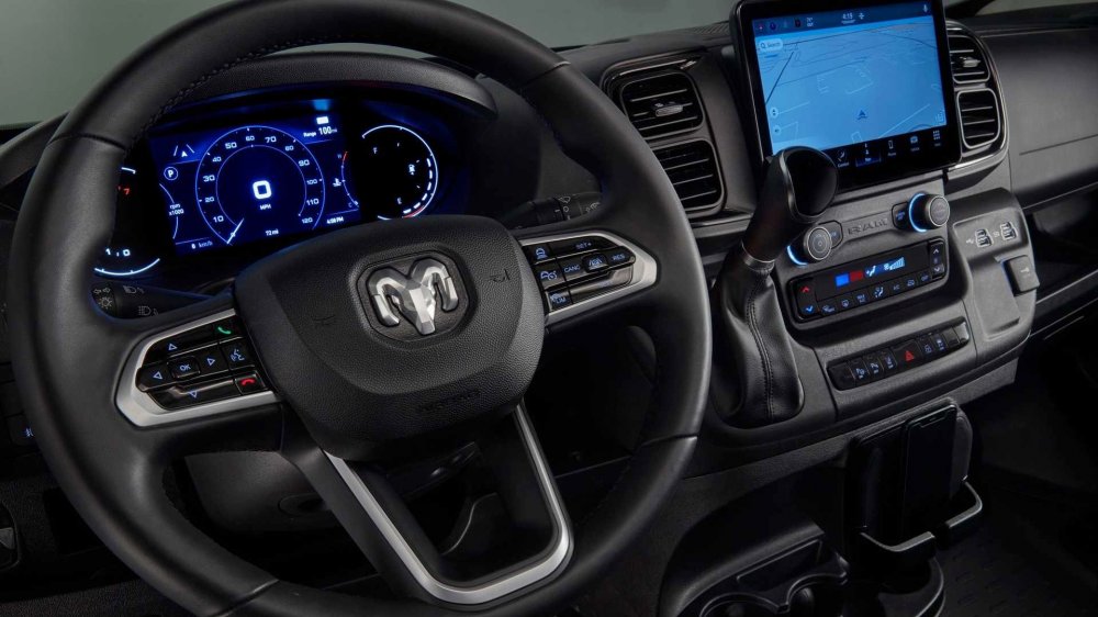Обновлённый интерьер ProMaster получил ещё в прошлом году вслед за Ducato. Диагональ экрана мультимедийной системы (Uconnect 5) составляет 7 либо 10 дюймов, есть поддержка Apple CarPlay и Android Auto, за доплату предлагаются беспроводная зарядка для смартфона, россыпь USB-портов разного формата и полноценная бытовая розетка (115 В, 150 Вт).
