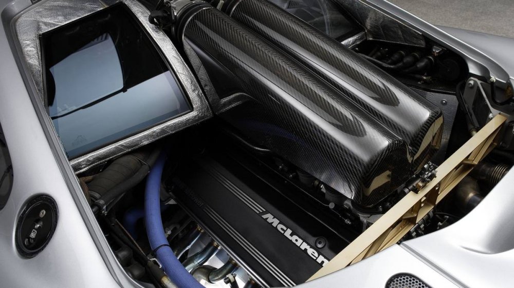 С 12-цилиндрового двигателя для «восьмёрки» удалось выжать 627 л. с. без турбонаддува. Зато необычной оказалась инновация, которую в McLaren применили для охлаждения лёгкого (266 кг) с учётом рабочего объёма и мощности силового агрегата – теплоизоляция моторного отсека из... золотой фольги.