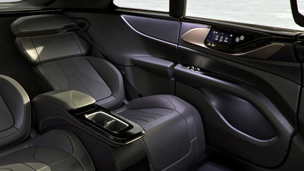 В салоне FF 91 установлены 11 экранов, в том числе выдвигающийся из потолка гигантский 27-дюймовый «телевизор» для задних пассажиров. Во втором ряду — два индивидуальных кресла «с нулевой гравитацией», которые при желании можно разложить в кровать. В целом по уровню оснащения FF 91 будет сопоставим с топ-версией седана Lucid Air. Лифтбек Tesla Model S Plaid ещё динамичнее, но проще в плане комфорта и отделки.
