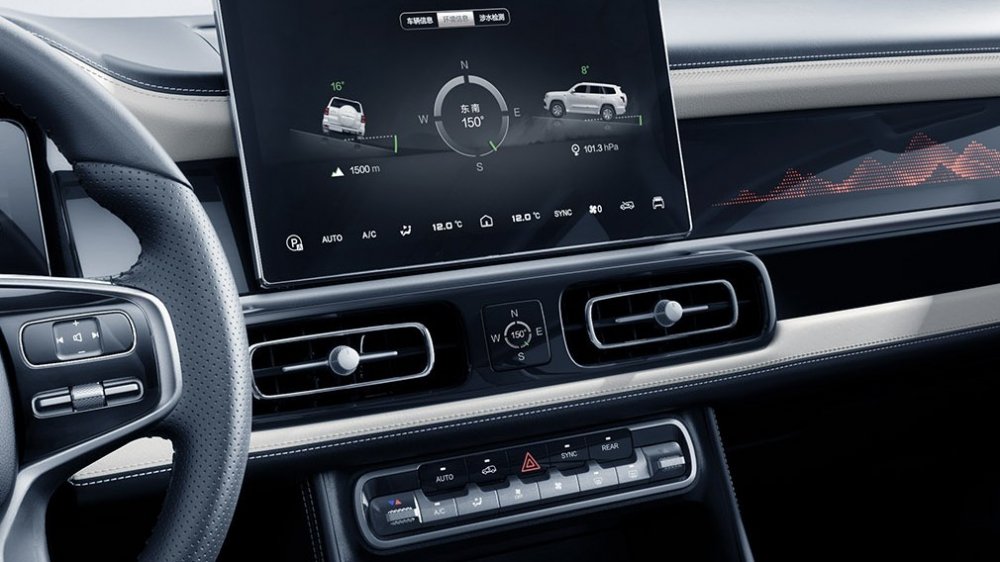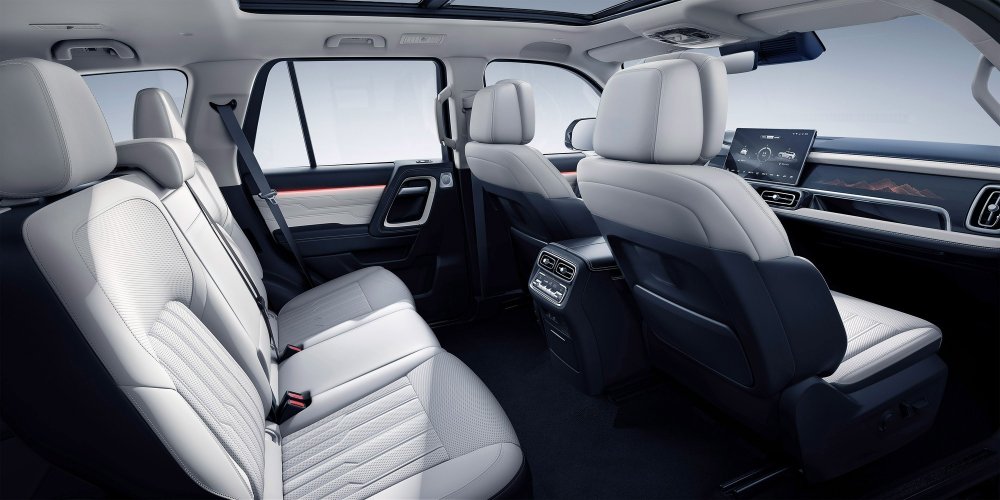 Между тем салон у BJ60 полностью самобытный и современный, с полностью виртуальным 10-дюймовым щитком приборов, «парящим» 12-дюймовым мультимедийным экраном и эффектной «цветомузыкой» перед передним пассажиром. Между центральными дефлекторами передней панели есть отдельный маленький экранчик с компасом. Стеклоподъёмники разместились на подоконниках, как у внедорожников Land Rover прошлого поколения. В отделке очень много кожи, топовая аудиосистема будет от Infinity, пассажирам второго ряда положен собственный блок климат-контроля. Третий ряд сидений — факультативный, BJ60 можно будет купить и без него.