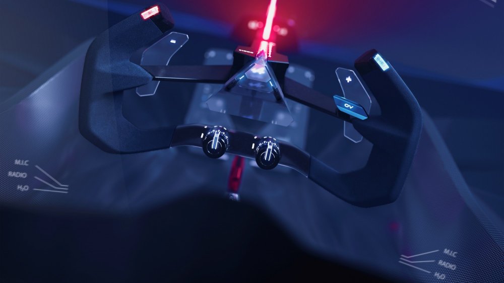 В минималистичном кокпите тоже многие элементы выполнены из прозрачного материала — например, педали и лепестки на руле. Сам руль — многофункциональный, он напоминает штурвал гоночных прототипов класса LMP1, светящаяся пирамида в центре — это ключ, который нужно вставить в руль перед запуском силовой установки.