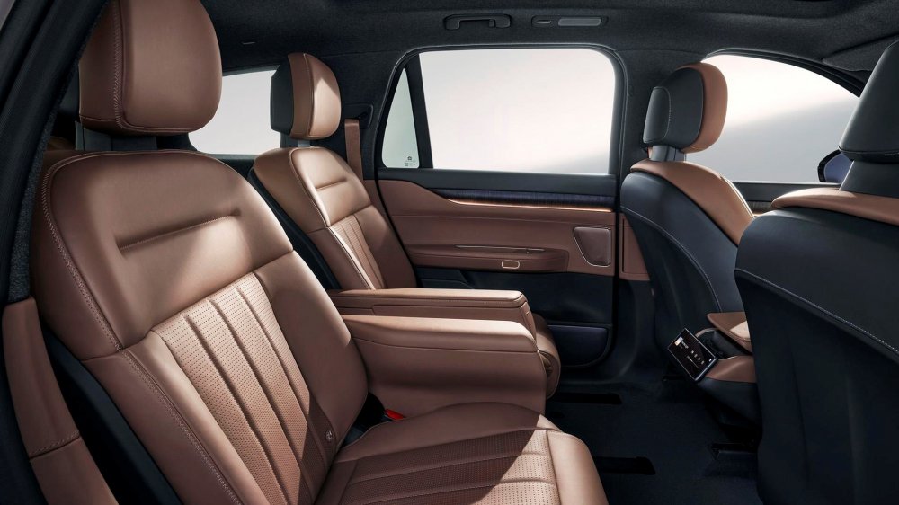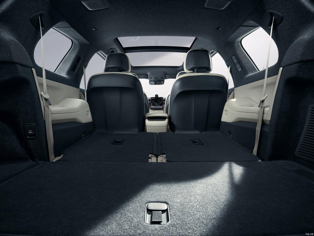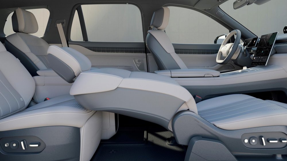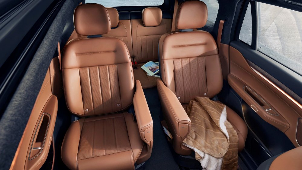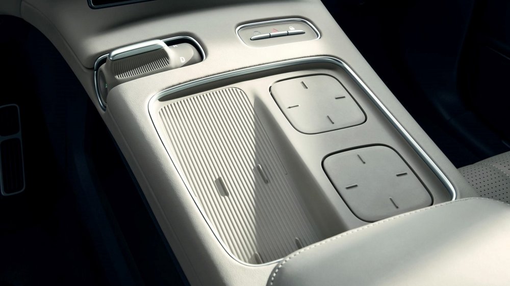 Пространство между креслами второго ряда можно занять тумбой-органайзером со встроенным холодильником и полочками беспроводной зарядки для смартфонов. Кресла в первом и втором рядах снабжены множеством регулировок, подогревом, вентиляцией и массажёрами. Объём багажника за третьим рядом — 235 л, со сложенным третьим рядом — 552 л, а вот сложить второй ряд из-за сложной технической начинки кресел нельзя — только откатить вперёд и установить спинки ближе к вертикали.