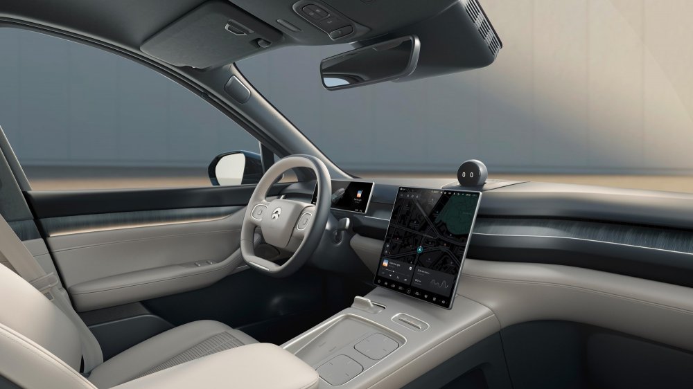С места водителя ES8 мало чем отличается от младших соплатформенных кроссоверов ES7/EC7, но у флагмана своя палитра отделочных материалов и чуть более сложный дизайн дверных карт. Общий для всех новых моделей Nio центральный мультимедийный экран имеет диагональ 12,8 дюйма, над ним установлена говорящая голова робота-асисcтента Nomi. Водительский узенький приборный экранчик дополнен 16,3-дюймовым проекционным дисплеем. Аудиосистема с 23 громкоговорителями — самая мощная в гамме (2230 Вт!), развлечения (фильмы и игры) предоставляет фирменная консоль N-Box с очками виртуальной реальности.