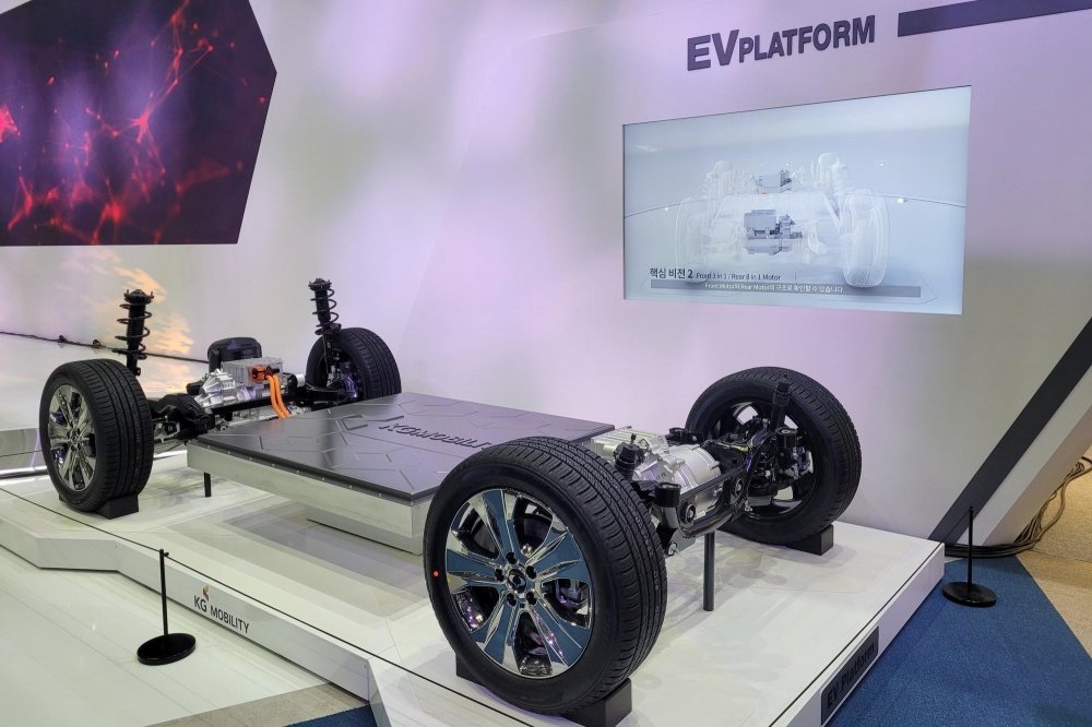 Помимо концептов KG Mobility показала прототип платформы для будущих электромобилей, у неё два электромотора (по одному на ось), которые являются частью глубоко интегрированных силовых модулей — проще говоря, конструкция очень компактная. Разработка этой платформы, согласно пресс-релизу, должна завершиться к 2026 году, то есть ближайшие новинки, очевидно, будут сделаны не на ней.