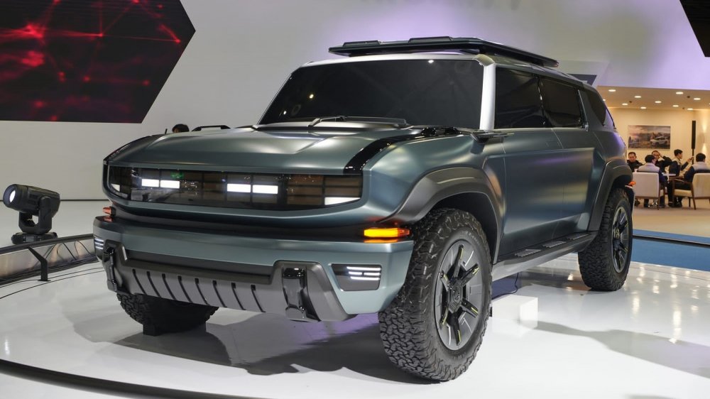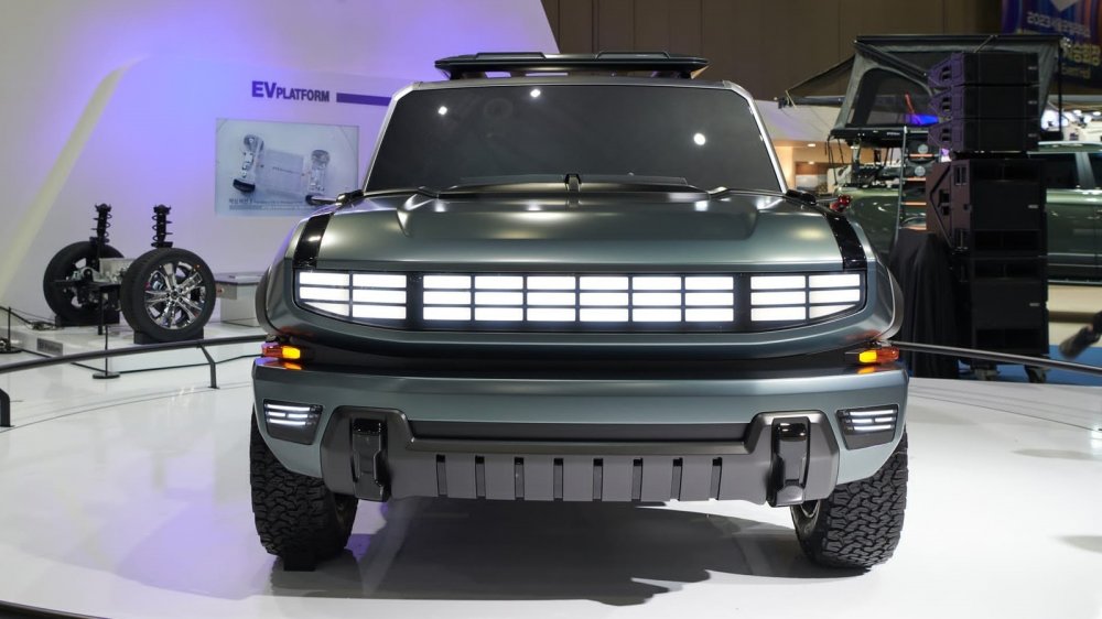 F100 — это большой электрический внедорожник в типичном для SsangYong стиле, щедро сдобренном диодной «цветомузыкой»: передок представляет собой световое табло с крупными пикселями, из которых можно складывать незамысловатые узоры и рисунки.