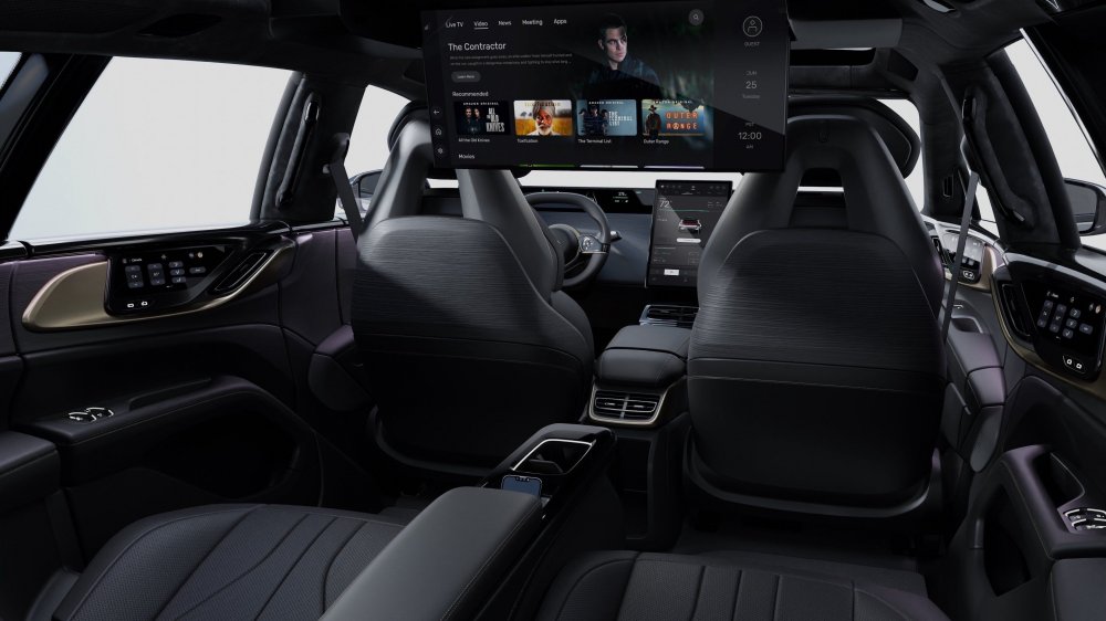 Просторный салон Faraday Future FF 91 рассчитан на четырёх седоков, во втором ряду установлены кресла-кровати «с нулевой гравитацией», в стандартное оснащение входят 11 экранов, в том числе выдвигающийся из потолка гигантский 27-дюймовый «телевизор» для задних пассажиров.