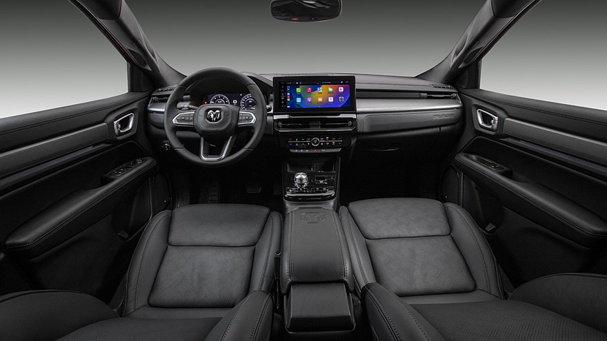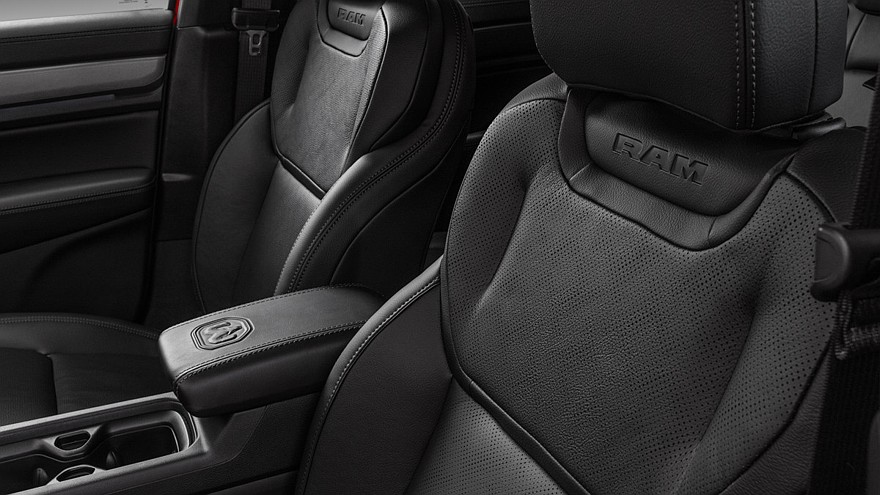 Салон у Ram Rampage Night Edition тоже имеет свои отличия. Так, кресла, двери и передняя панель отделаны чёрной кожей, которая заменила коричневую кожу Laramie. В чёрном цвете также оформлены динамики акустической системы и крыша. Диагональ виртуальной приборки равна 10,3 дюйма, тачскрина информационно-развлекательной системы – 12,3 дюйма. В списке оборудования числятся двухзонный климат-контроль, функция беспроводной зарядки смартфонов, семь подушек безопасности, адаптивный круиз-контроль и мониторинг слепых зон.