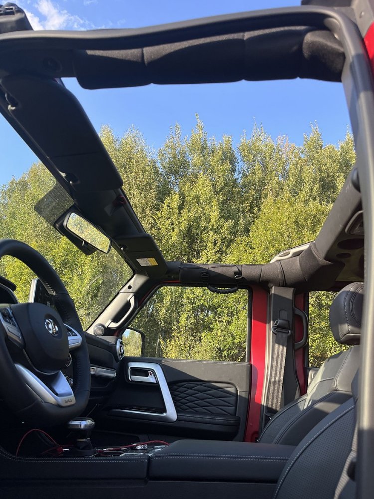 Пока покупал канистру с AdBlue на заправке, BAIC успел собрать нескольких неравнодушных к автомобильной технике зевак, и мне пришлось ответить на пару вопросов. Нет, это не лицензионный Джип, это самостоятельная разработка. Да, тут все по-взрослому: полный привод Part-Time с понижайкой. И да, этот шикарный красный цвет – не плод тюнинга, а стоковый матовый металлик.