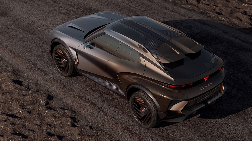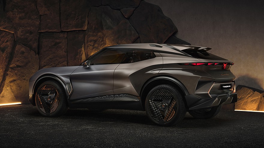 Корму снабдили разделённым надвое спойлером в верхней части багажной двери, фонарями в виде отдельных треугольников со светящимся логотипом бренда по центру, а также агрессивным диффузором в нижней части заднего бампера. Крыша имеет Y-образный каркас и пару съёмных панелей. Известно, что габаритная длина Cupra Tindaya составляет 4,72 метра, а размер его колёсных дисков – 23 дюйма.