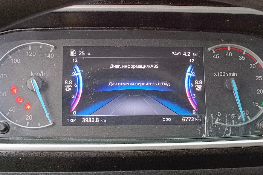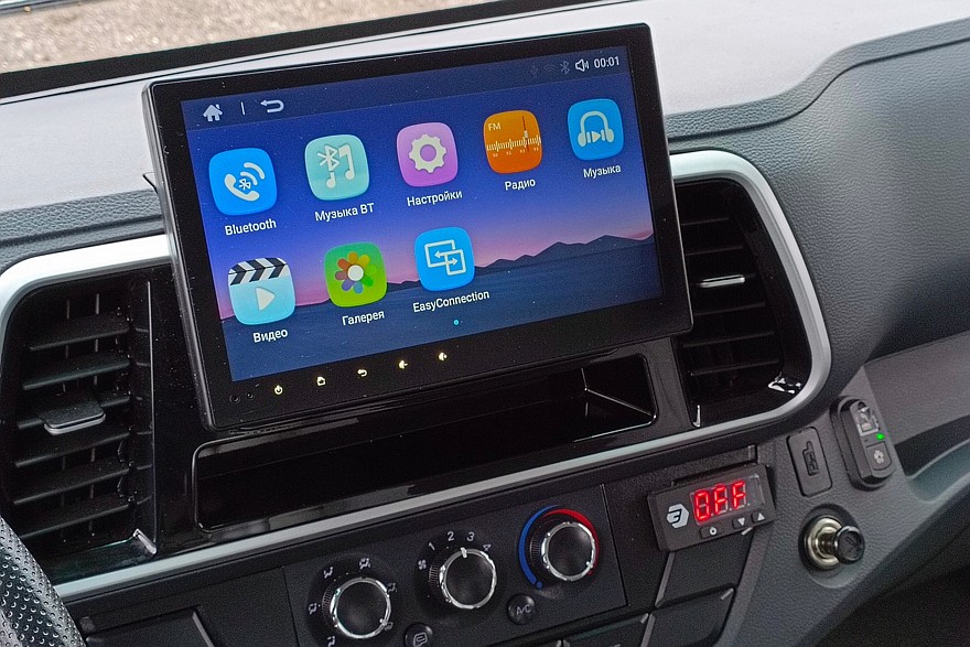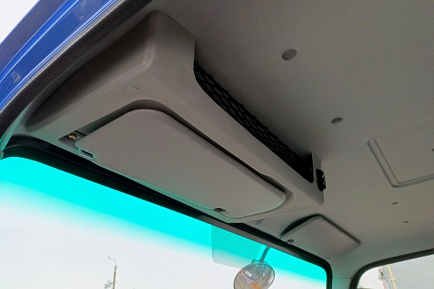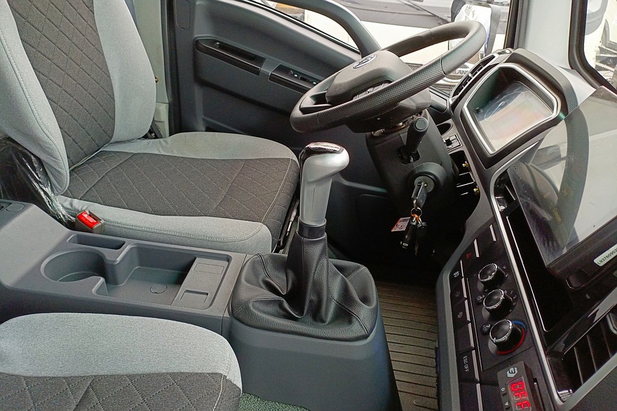 На мультируле основные клавиши регулировок — громкость, выбор радиостанций, управление круиз-контролем и мультимедийной системой с 12-дюймовым цветным дисплеем. У всех Sollers TR80 все эти функции есть в базовом оснащении. Особенно интересно наличие круиз-контроля: для городской эксплуатации — это не самая необходимая функция. Но в любом случае полезная, поскольку распределительные центры нередко находятся на трассах за городом, и добираться до них, безусловно, удобнее на круизе. Тем более что у «восьмидесятки» он держит выбранную скорость очень точно.
