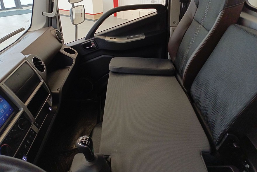Даже совсем немного посидев в кабине Forland 8, сразу чувствуешь, что эргономику автомобиля и внутреннее пространство рисовали люди, хорошо знакомые со спецификой предстоящей эксплуатации. За исключением каких-то малозначительных нюансов продумано практически все. Они постарались просчитать сценарии на несколько шагов вперед и позаботились даже о матрасике, который прячется за спинками и раскладывается на сиденьях, чтобы водитель мог комфортно отдыхать. А чтобы ногам ничего не мешало, рычаг стояночного тормоза максимально смещен к задней стенке. Да, сидя в кресле, дергать за него не очень удобно, но для безмятежного сна во весь рост – самое то.