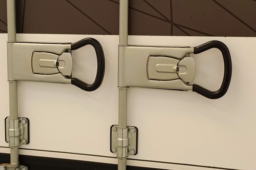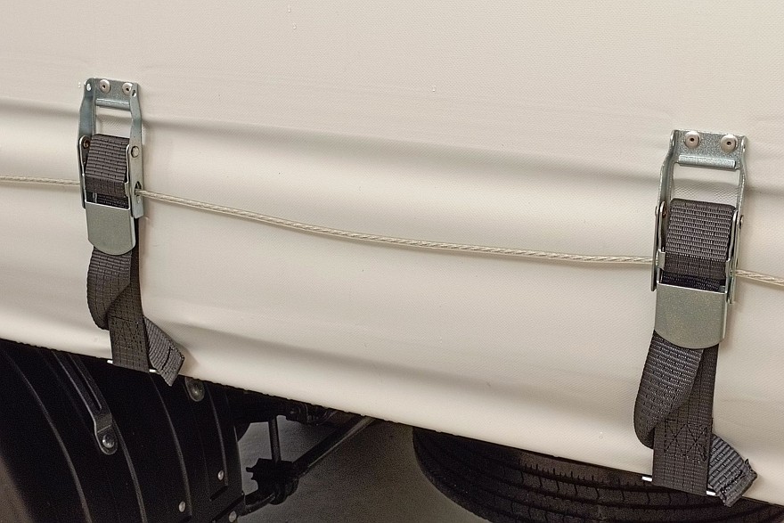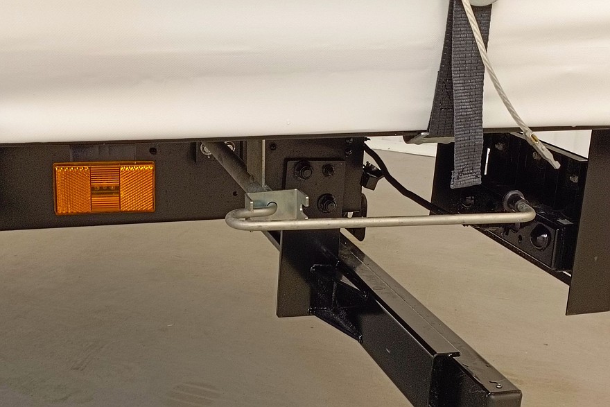 Направляющие шторы алюминиевые, ролики – металлические. Быстросъемная перегородка посередине движется на отдельных роликах вперед и назад, что обеспечивает легкость погрузки с любой из сторон – как сзади, так и по бокам. Борта – алюминиевые. В передней стенке за фанерой скрыт металлический каркас, который защищает кабину водителя. Такелажные петли вмонтированы в обвязочный профиль. Это облегчает доступ к ним при любом размещении паллет и позволяет фиксировать груз, не сдвигая паллеты.