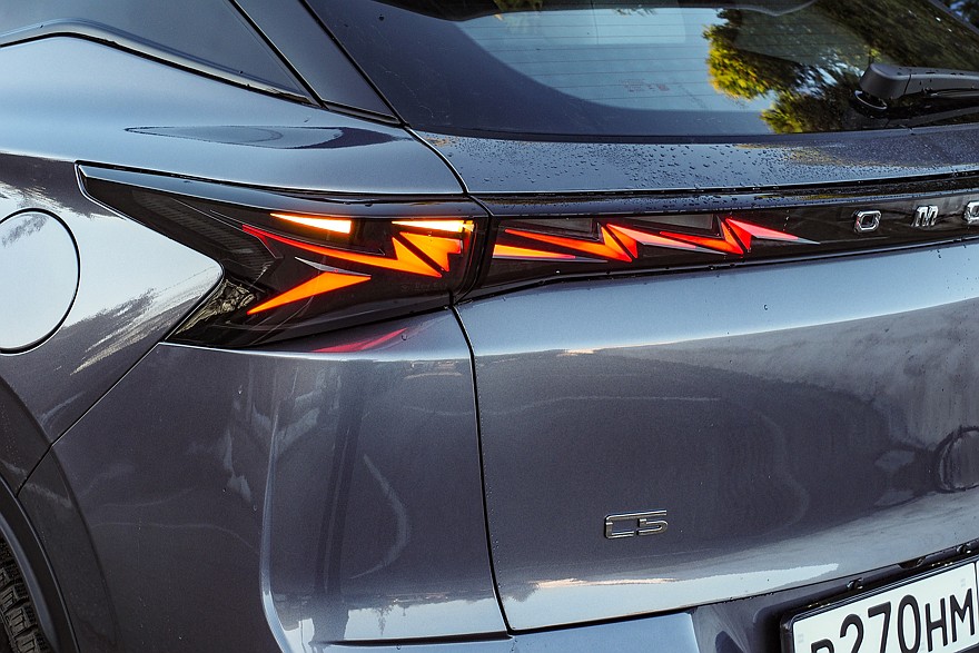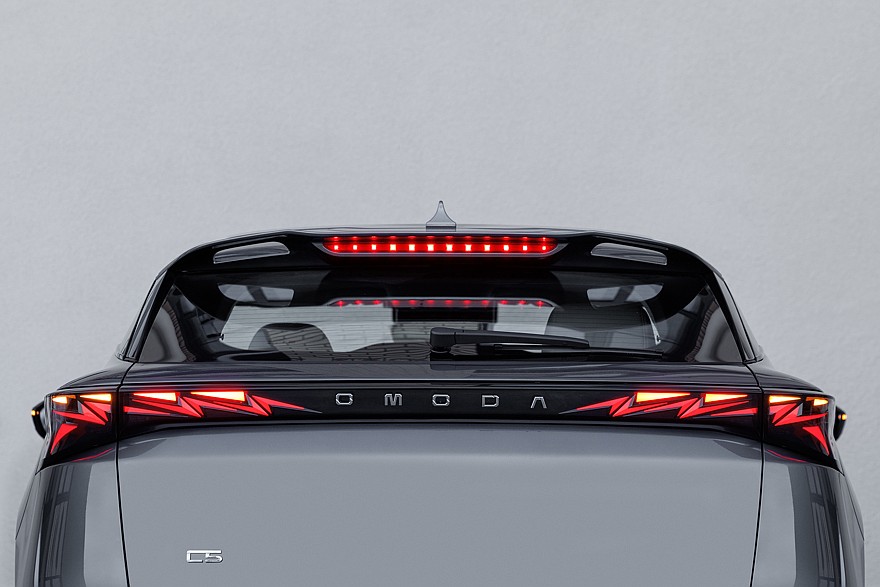 А вот оформление задней светотехники я однозначно занесу в список дизайнерских успехов. Набор фонарей в виде острых уголков, образующих «зигзаг молнии», и выглядит отлично, и достаточно оригинален для того, чтобы безошибочно опознать автомобиль в потоке. Точнее, опознать его как автомобиль марки Omoda, потому что такими же задними фонарями щеголяет и флагман марки кроссовер C7.
