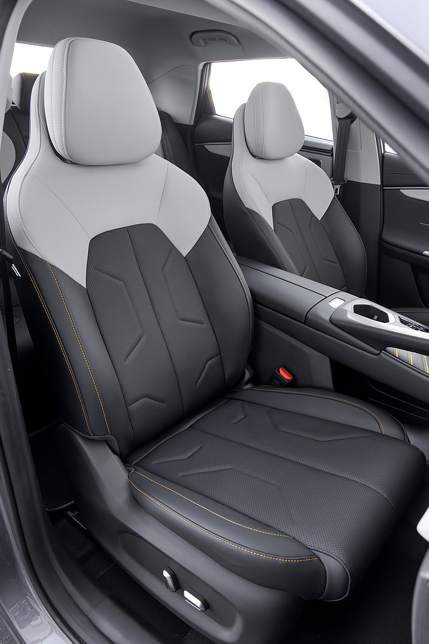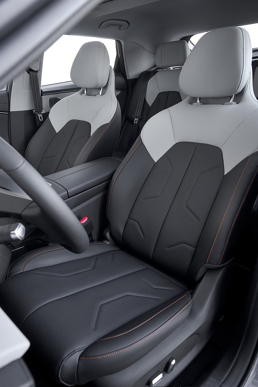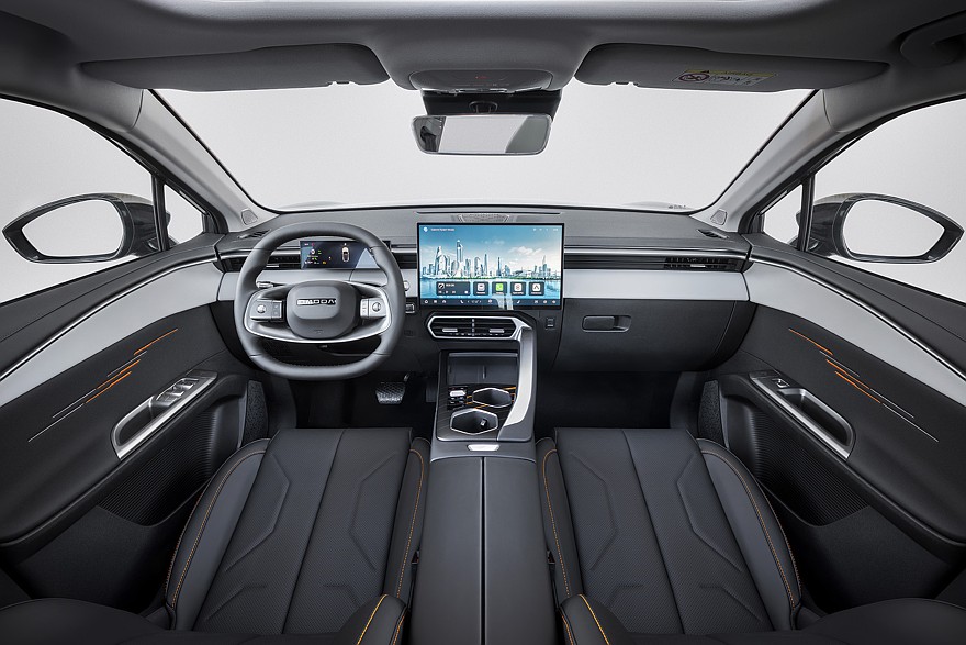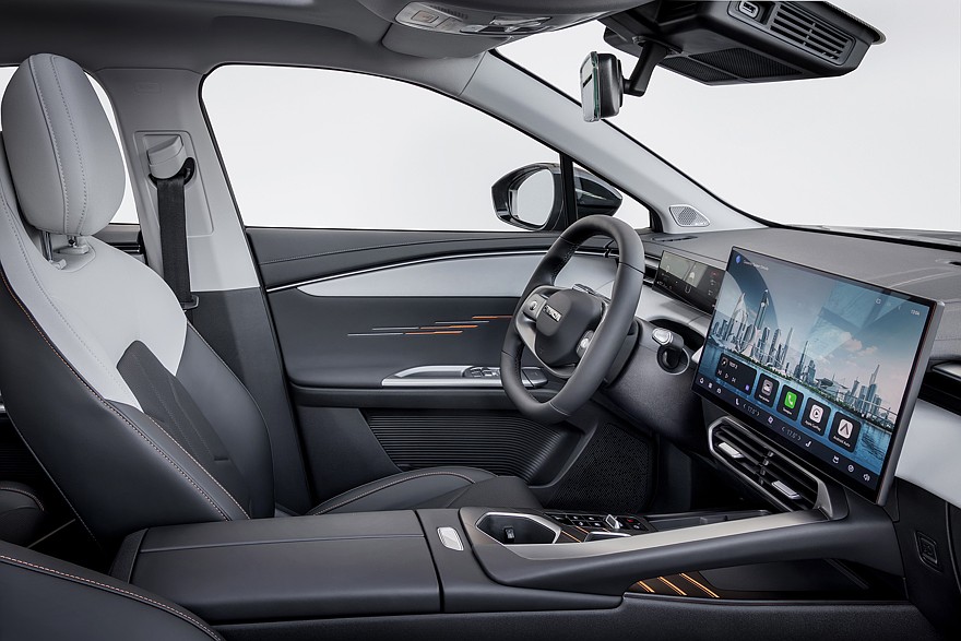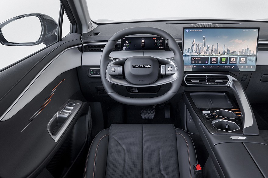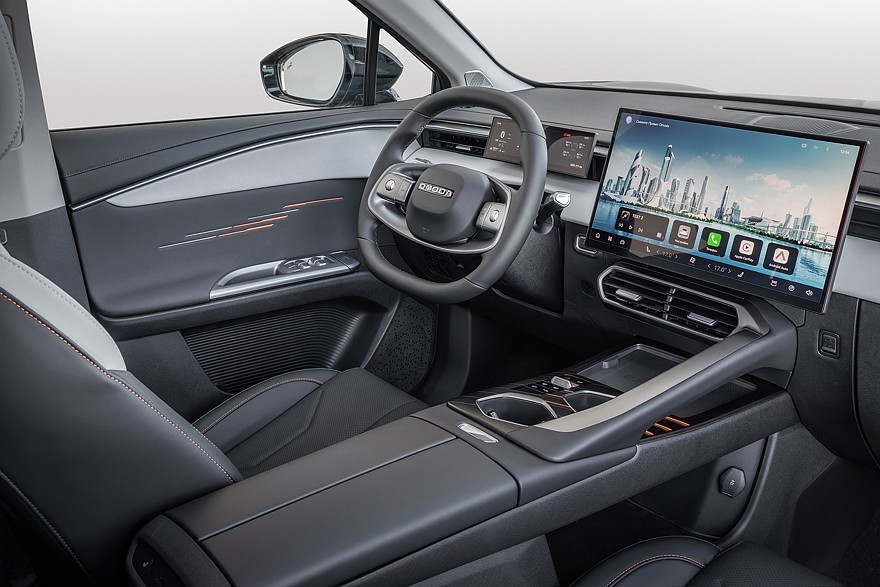 Переднюю часть салона перекроили до основания, причём в едином стиле и с использованием множества элементов от старшей модели C7. Передняя панель – многоуровневая, с интересным сочетанием текстур и чередованием жёсткого и мягкого пластика, как бы обнимающая обитателей переднего ряда. Руль футуристической формы, «сплюснутый» сверху и снизу. Вместо традиционной для автомобилей Chery спарки двух одинаковых по диагонали дисплеев – сочетание маленького экрана (у старших комплектаций – диагональ 8,8 дюйма, у младшей – ровно 8) и огромного 15,6-дюймового тачскрина медиасистемы.