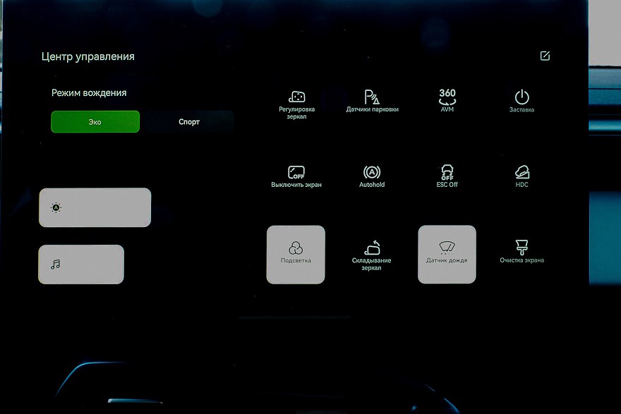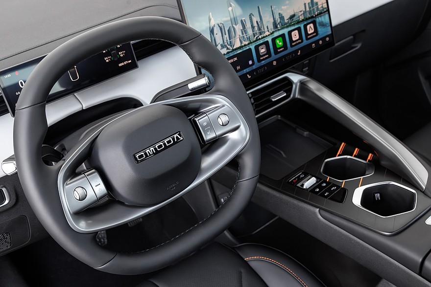 Опросы владельцев предыдущего Omoda C5 показали, что многие высказывают пожелания снабдить как можно больше функций отдельными физическими органами управления. Кое-что было сделано. Например, на центральной консоли есть «качалка» для переключения режимов движения и отдельные кнопки для включения подогревов переднего и заднего стёкол. Но полностью решить эту задачу всё-таки не получилось, хотя паллиативным решением стала постоянно видимая панель с сенсорными кнопками в нижней части главного экрана, на которую выведено в числе прочего управление климатом. Есть и панель с «центром управления», которая вытаскивается на экран свайпом сверху. Пользоваться этой панелью довольно удобно. Например, в режим настройки боковых зеркал можно войти через дерево меню, а можно просто выбрать иконку в этом «центре управления». Далее используем барабанчики и клавиши на спицах руля, для левого зеркала – на левой, для правого – на правой.