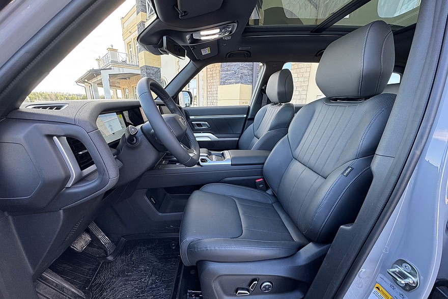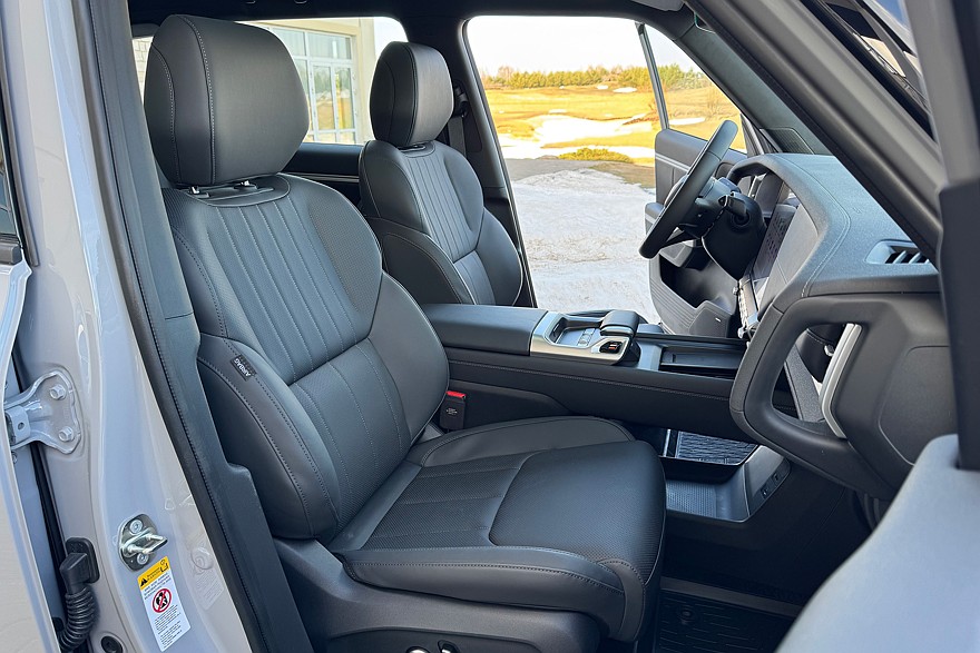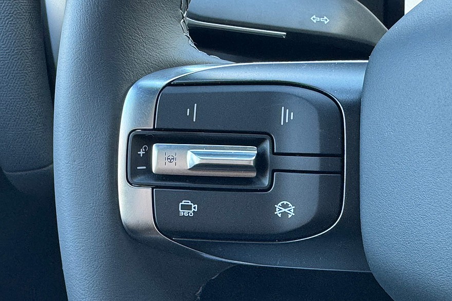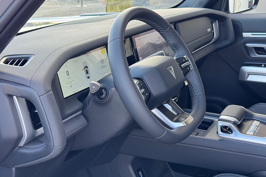 Интерьер продолжает эксплуатировать тему брутальной внедорожной эстетики: здесь нарочито грубоватые материалы и крупные поручни по бокам передней панели. Руль уже не круглый, но ещё не угловатый штурвал – спасибо и на этом. Диапазоны регулировки по вылету и углу наклона меньше, чем хотелось бы, а настроить зеркала или сменить режим работы фар можно только через мультимедийную систему.